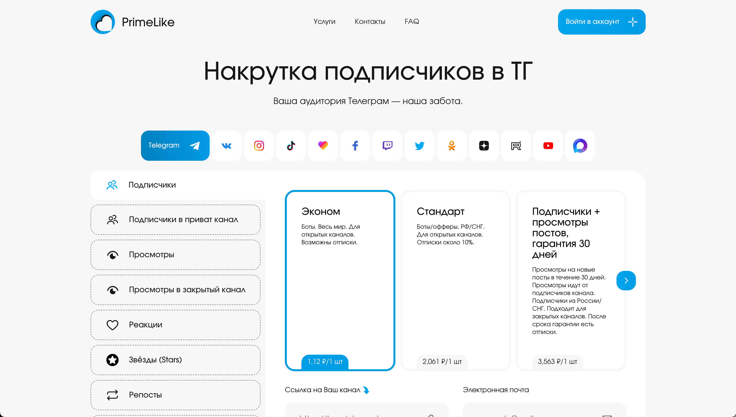 - Репосты — есть 3 тарифа: боты из разных стран, микс ботов и офферов из РФ и СНГ и репосты от аккаунтов с ТГ премиум;