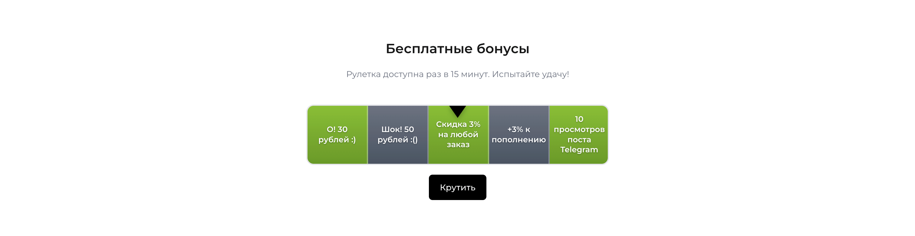 На том же Фейхоа можно крутить бесплатную рулетку каждые 15 минут. Там периодически выпадают бесплатные «30 просмотров поста Telegram», «20 подписчиков Telegram» или рубли на баланс, которые можно потратить на любые услуги. Если этого достаточно, то окей.
