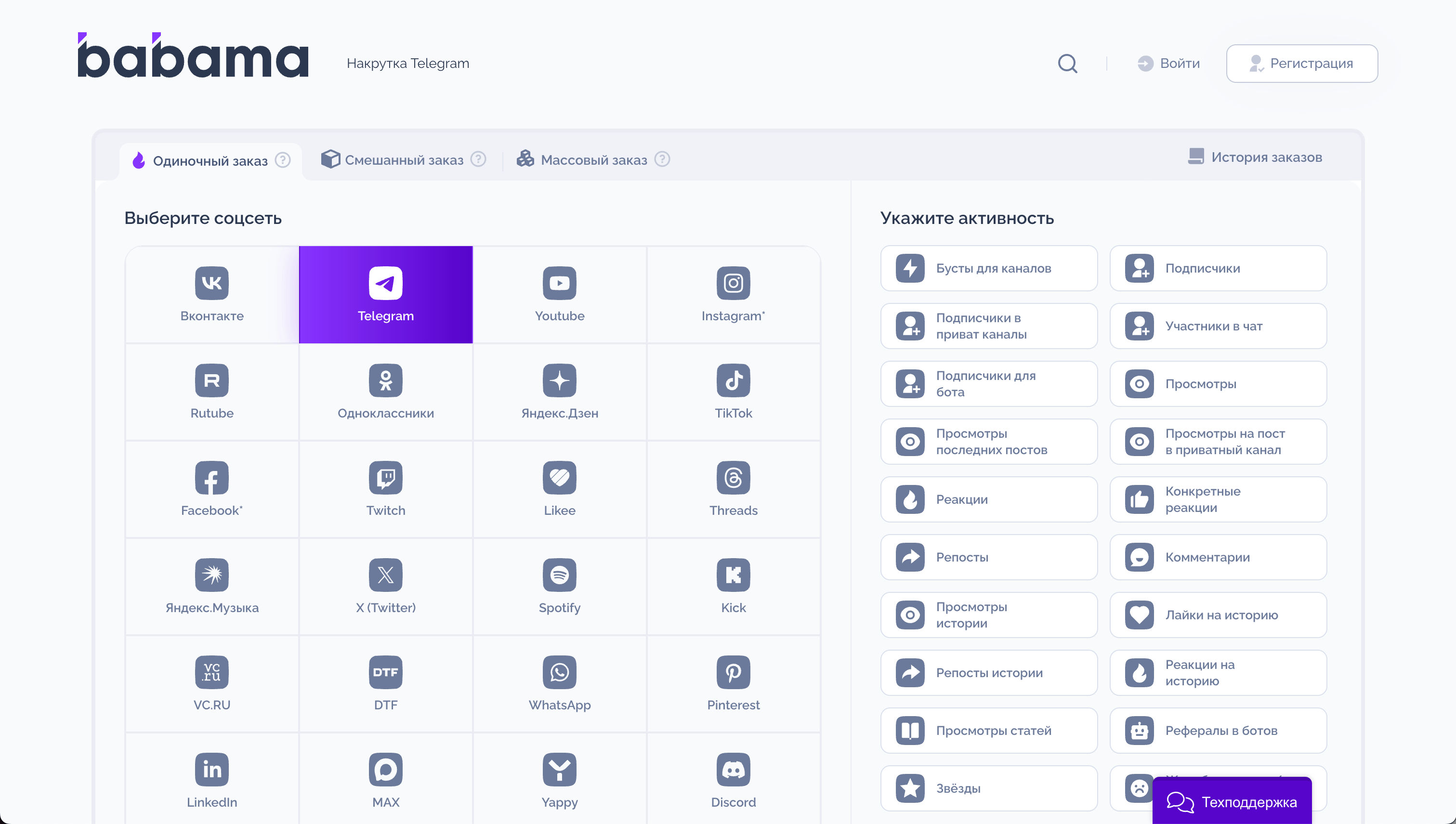 На Бабаме накрутить можно бусты, подписчиков (и в обычные, и в приватные каналы), участников в чат, подписчиков для бота, просмотры (и в обычные, и в приватные каналы), реакции, репосты, комментарии, просмотры историй, лайки на истории, репосты историй, реакции на истории, просмотры статей, рефералов в ботов, звёзды на пост или в профиль и жалобы на канал или чат.